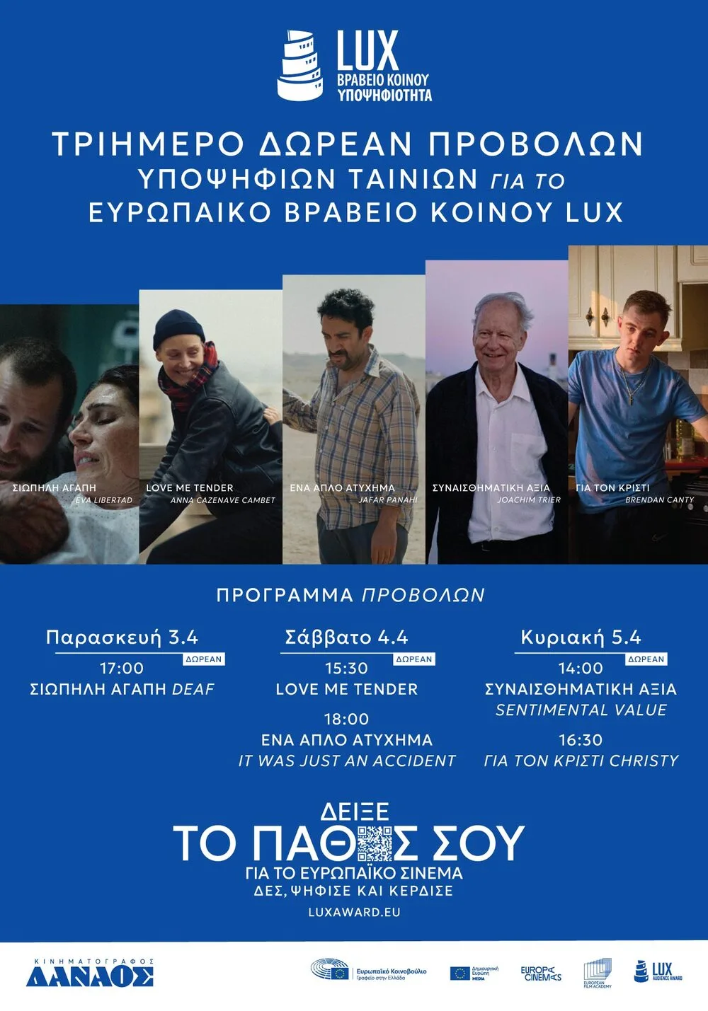 Το Γραφείο του Ευρωπαϊκού Κοινοβουλίου στην Ελλάδα σε συνεργασία με τον κινηματογράφο Δαναό σας προσκαλούν σε ένα μοναδικό τριήμερο προβολών, όπου μπορείτε να παρακολουθήσετε δωρεάν τις πέντε υποψήφιες ταινίες για το Βραβείο Κοινού LUX 2026. Οι προβολές θα πραγματοποιηθούν στις 3, 4 και 5 Απριλίου, προσφέροντας στο κοινό την ευκαιρία να δει, να βαθμολογήσει και να επιλέξει τη φετινή νικήτρια ταινία στην ειδική πλατφόρμα αξιολόγησης έως τις 12 Απριλίου.