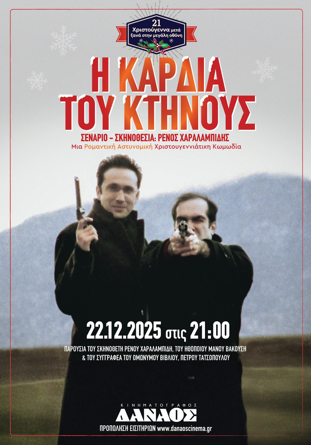 Ο κινηματογράφος ΔΑΝΑΟΣ παρουσιάζει τη μοναδική εορταστική προβολή της ταινίας “Η Καρδιά του Κτήνους” τη Δευτέρα 22 Δεκεμβρίου 2025 στις 21:00, με την παρουσία του σκηνοθέτη Ρένου Χαραλαμπίδη, του ηθοποιού Μάνου Βακούση και του συγγραφέα του ομώνυμου βιβλίου, Πέτρου Τατσόπουλου. Την προβολή θα προλογίσει ο ίδιος ο Χαραλαμπίδης με σαιξπηρικά σονέτα, σε μια απρόσμενη και άκρως γοητευτική εισαγωγή .