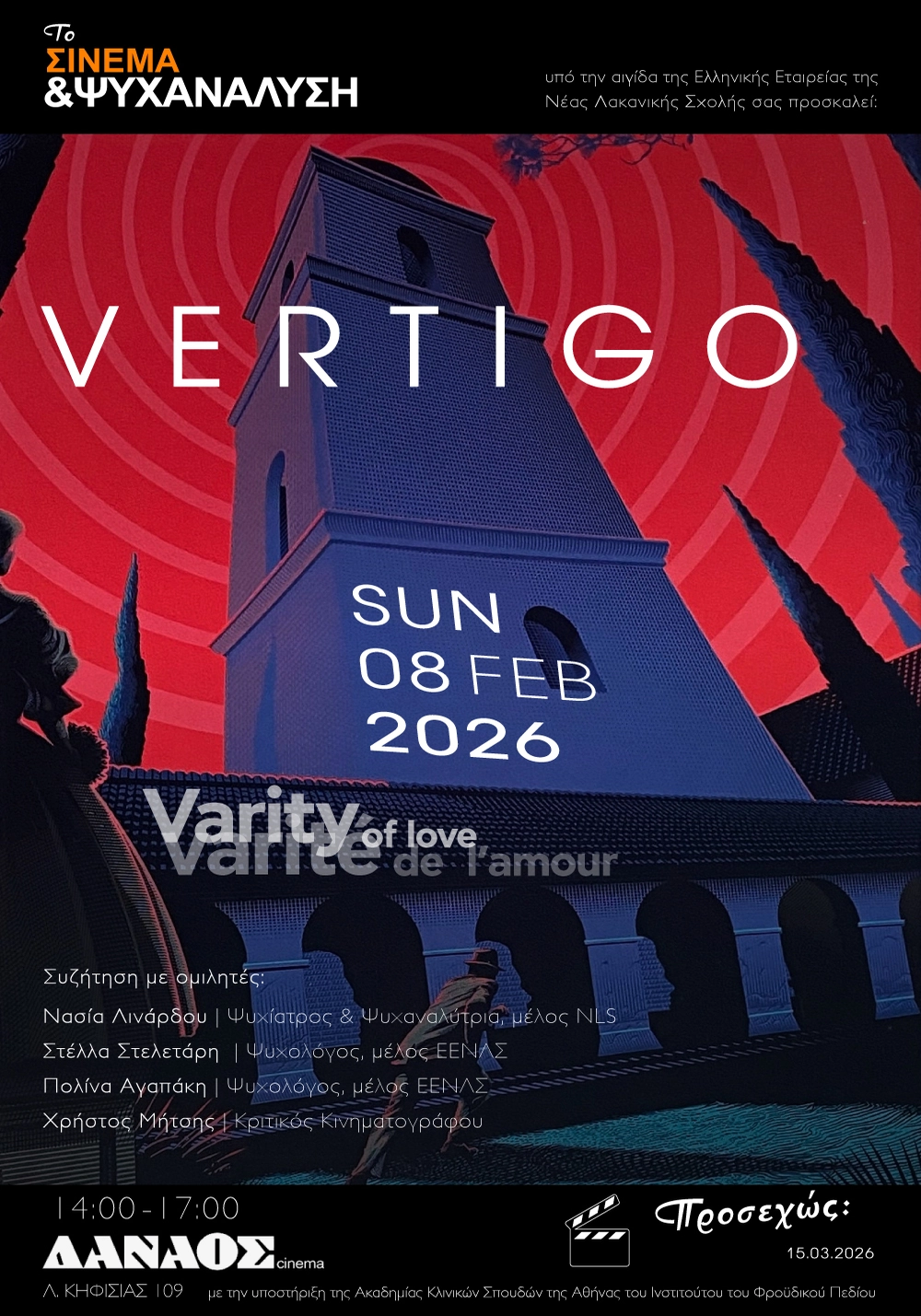 Το Σινεμά & Ψυχανάλυση υπό την αιγίδα της Ελληνικής Εταιρείας της Νέας Λακανικής Σχολής και με την υποστήριξη της Ακαδημίας Κλινικών Σπουδών της Αθήνας διοργανώνει την προβολή της ταινίας “Δεσμώτης του Ιλίγγου” του Άλφρεντ Χίτσκοκ, την Κυριακή 8 Φεβρουαρίου 2026 στις 14:00 στον κινηματογράφο Δαναό.